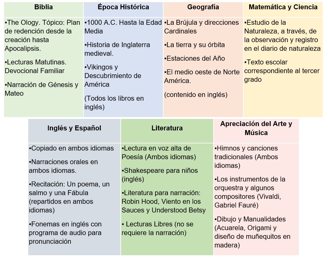 Toda esta visión general que les comparto incluye libros correspondientes para cada área. Recordemos que Charlotte Mason utilizaba lo que consideraba la mejor literatura como el medio propicio para la trasmisión de ideas y conocimiento. Leemos para la época histórica, biografías, historia de mártires y de misioneros, también novelas y cuentos correspondientes a la época histórica; libros de carácter literario sobre animales y sobre lugares geográficos.