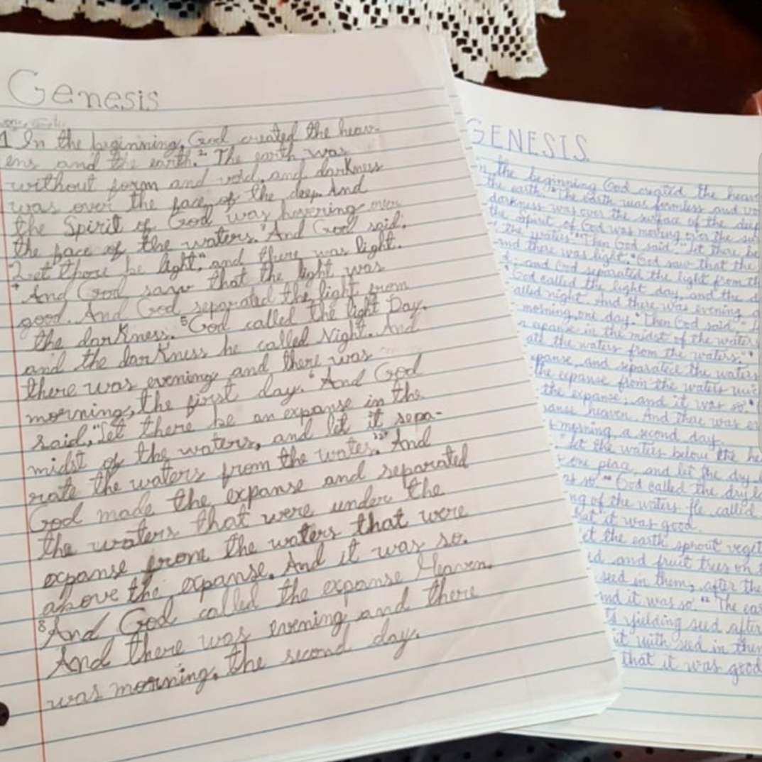 El copiado, que es en ambos idiomas, lo hacemos en cuadernos diferentes. En inglés hemos creado algo que se llama «Proyecto Escriba». Después de un tiempo de constante lucha, decidimos copiar los libros de la Biblia, empezamos y estamos por Génesis, máximo dos versículos diarios. En español, Omellette escoge una fábula, poema o himno de su preferencia. Este año se encariñó con las Fábulas de Rafael Pombo. Copia una estrofa, una o dos veces por semana.