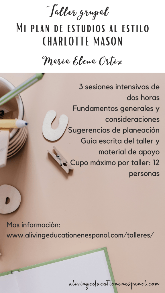 Por otro lado, sabiendo también sobre la necesidad de ayudas prácticas en la comunidad para la implementación de la filosofía, he diseñado un taller de planificación para educadores que hayan leído el libro de Mente a Mente o estén《completamente》 familiarizados con la filosofía educativa, sus pilares (libros vivos, narración, cultura materna) y principios. Este taller no pretende cubrir de forma inequívoca toda la información referente al tema, pero si es el resultado de un esfuerzo consciente e investigativo de mi parte. Hay mucho por recorrer y por crecer, pero deseo que este taller sea un alivio mientras el camino se esclarece con el tiempo y el SEÑOR levanta más obreros en la comunidad.