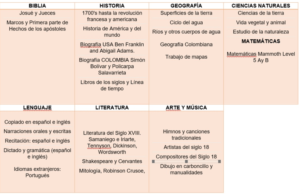 Literatura y narraciones: Este año combinamos un poco más nuestras lecturas para narrar en ambos idiomas. Leímos en español: la Biblia (seguimos el plan de lectura de Ambleside, Year 4), Robinson Crusoe, y literatura correspondiente a nuestro país de origen. También leímos Las Fábulas de Samaniego y algunas selecciones de poemas del siglo 18. El resto se leyó y se narró en inglés.