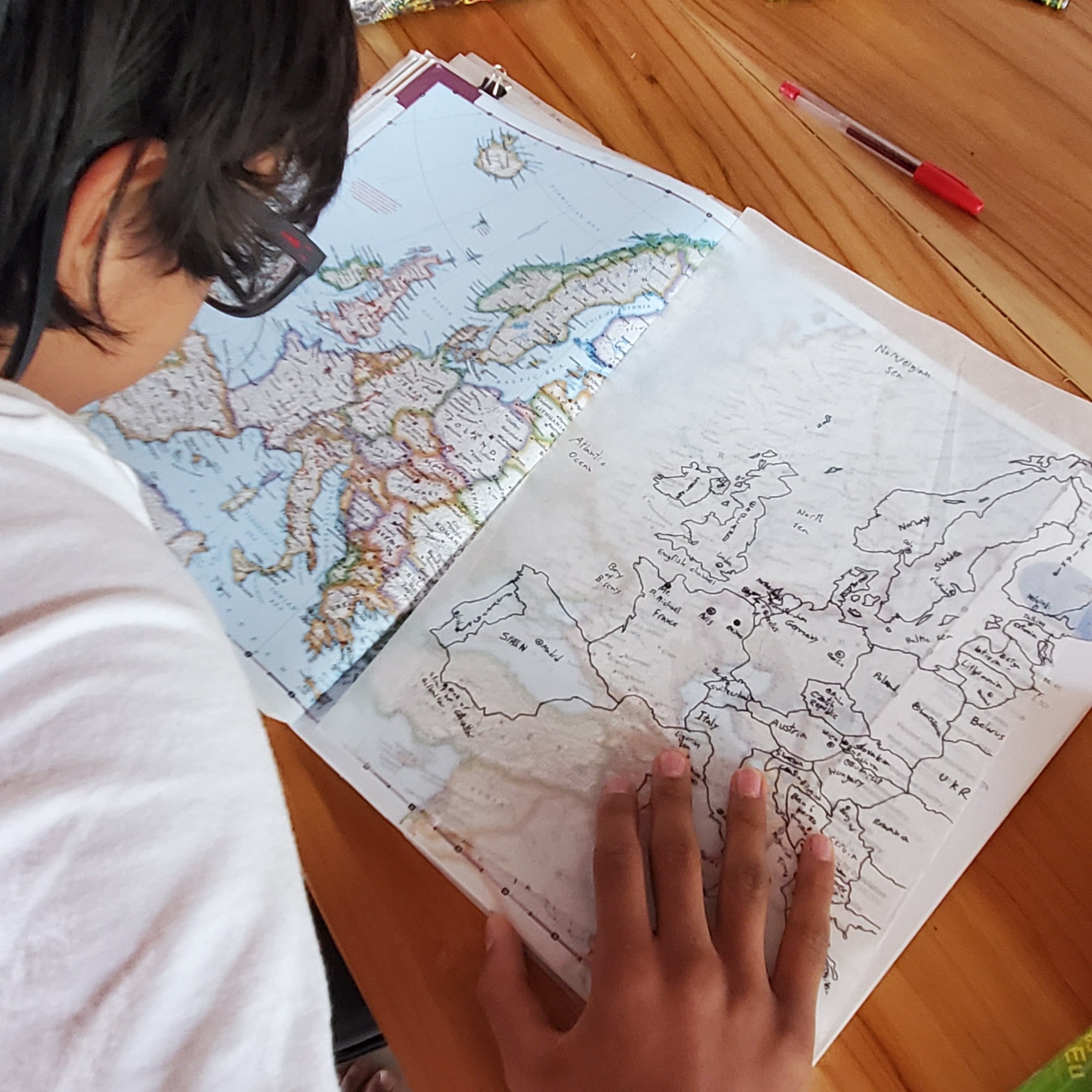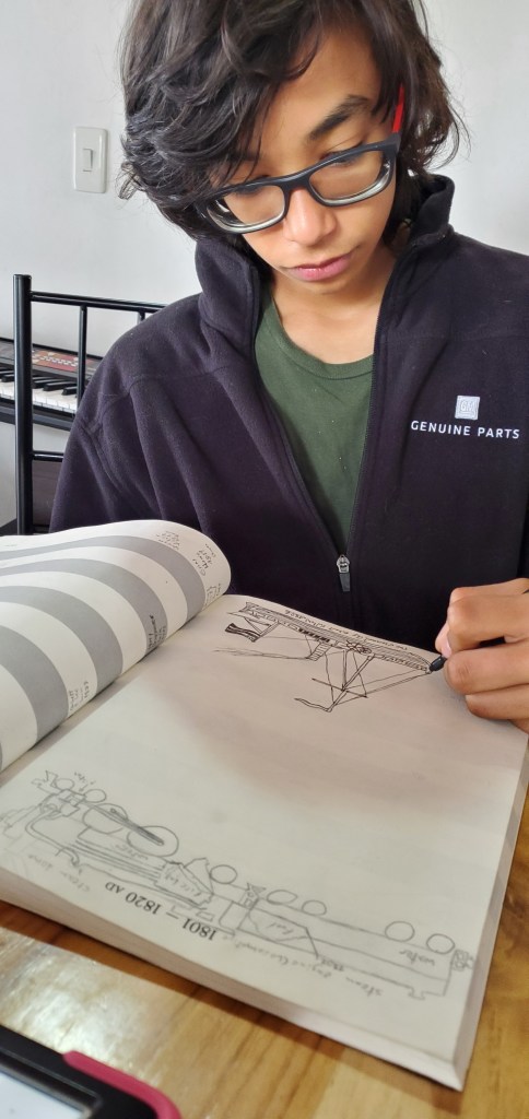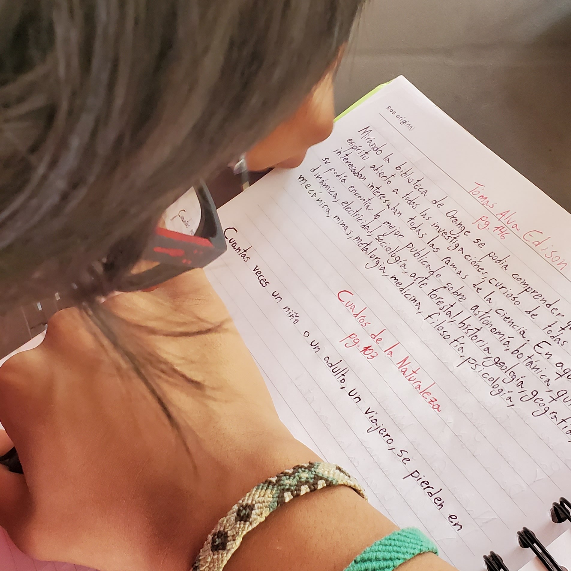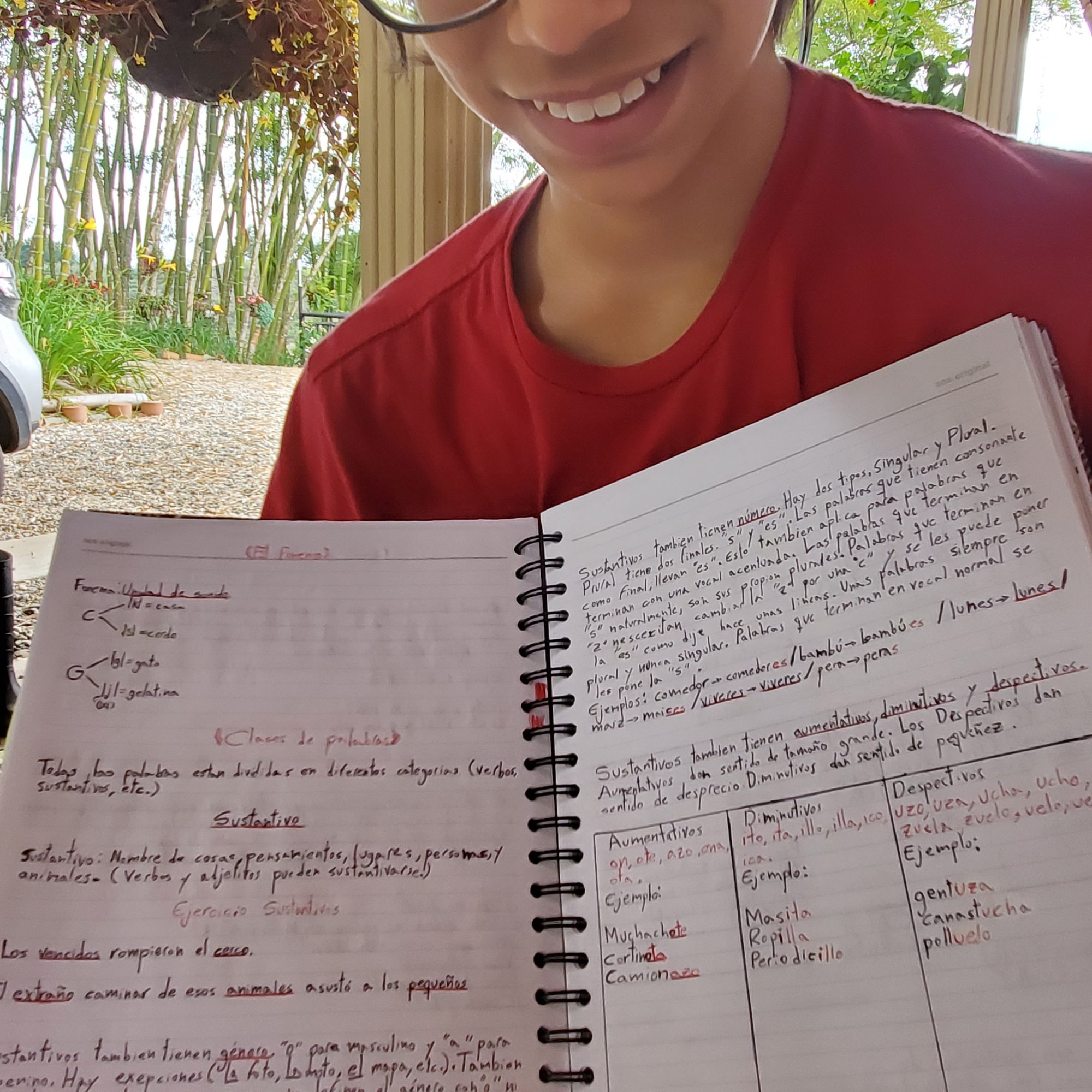 En el copiado, que hacemos en ambos idiomas, seguimos transcribiendo porciones de sus lecturas de literatura, geografía, historia y ciencias. Este año turnamos sus transcripciones en inglés y en español una vez que termina cada selección respectivamente. Intento marcar algunas páginas de sus libros con selecciones para copiado pero cada vez más le animo a escoger por sí mismo lo que desee copiar. Para el portugués, Daniel escribe todos los días en un cuaderno uno o dos versos bíblicos ya que su Biblia de lectura personal está en ese idioma, esta actividad la lleva a cabo en su tiempo de devocional antes de que todos nos dispongamos a desayunar y empecemos las lecturas matutinas familiares. Refuerza este tercer idioma con la aplicación Duolingo y nos estamos proyectando en la búsqueda de un tutor para el siguiente año.