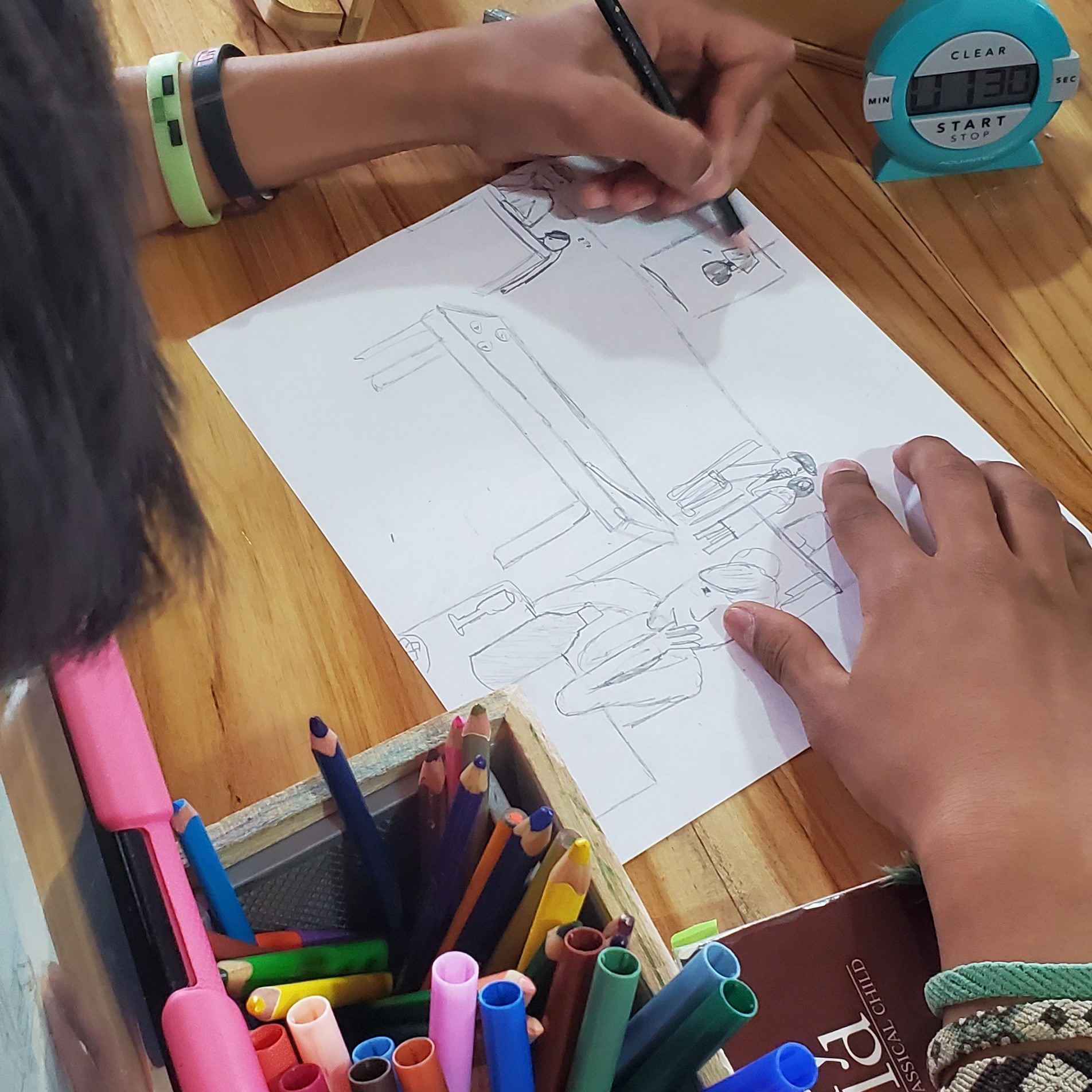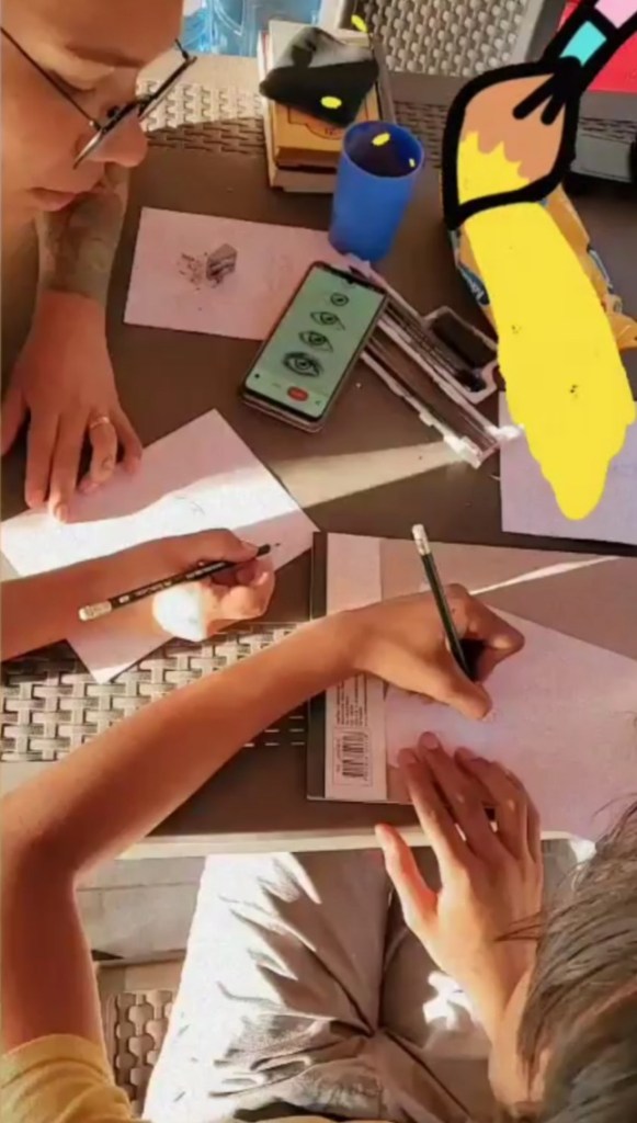 Dibujo: seguimos con el lápiz carboncillo, esta vez con ayuda de algunos manuales de dibujo técnico profundizamos el dibujo de partes del rostro y cuerpo. Igualmente continuamos con algunas asignaciones que se requerían en las escuelas de la Señorita Mason como: dibujos de personajes y escenas de sus lecturas, y dibujos a partir de observaciones cuidadosas en sus diarios de naturaleza.