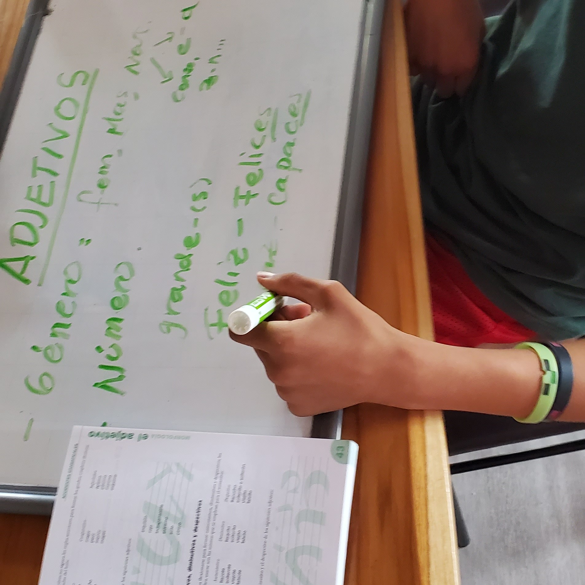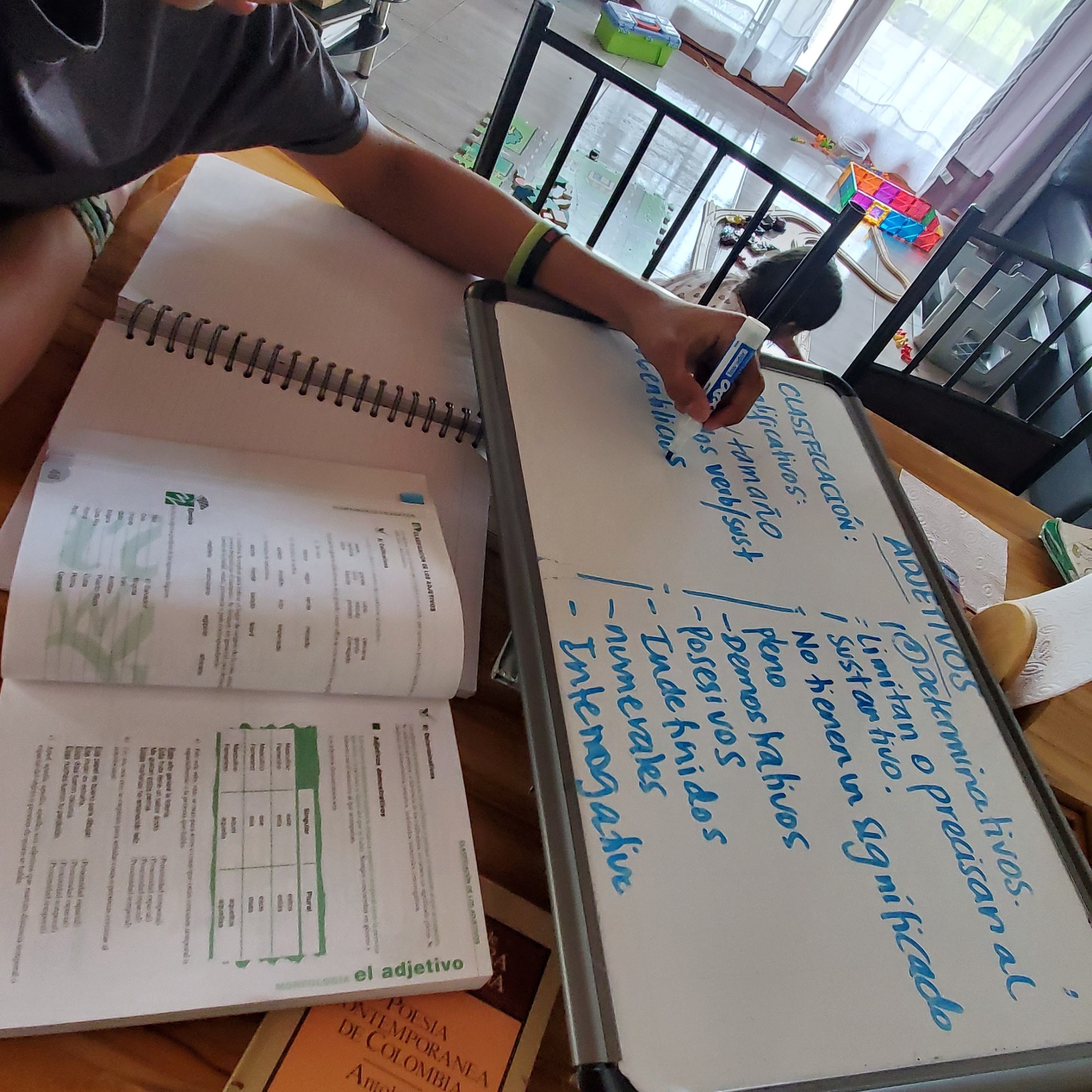 Gramática: Este año decidimos tomarnos más tiempo necesario en los conceptos gramaticales, y empezamos a registrarlos en un cuaderno con ejemplos cotidianos, repasamos y nos aseguramos de entenderlos bien. Continuamos con el mismo libro guia y también usamos las lecturas de su currículo para identificar algunos conceptos. Para la gramática inglesa este año contamos con la inmensa bendición del apoyo de una mamá colega cuyo idioma nativo es el inglés y junto con sus hijos una vez por semana en lo posible desarrollan las actividades correspondientes.