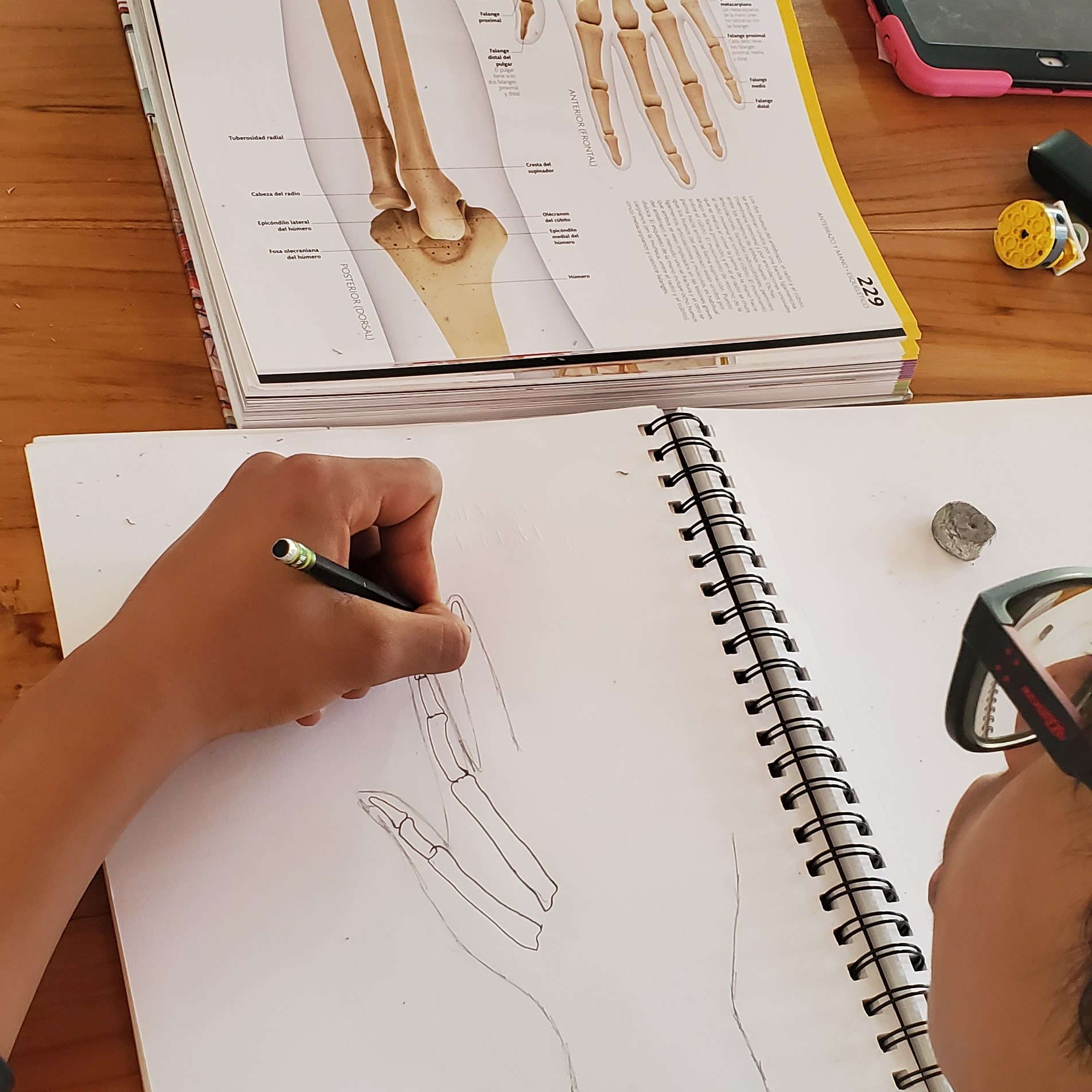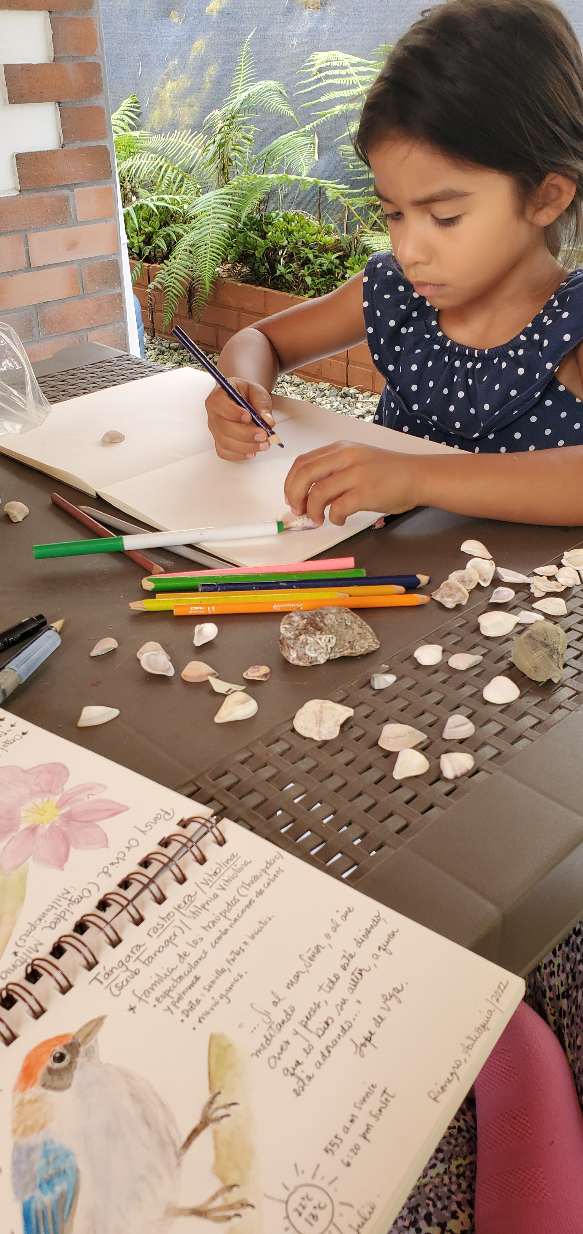 Ciencias formales y Estudio de la naturaleza: La comunidad local que hemos formado recientemente ha sido clave para esta asignatura. Nos reunimos un día por semana y en ese tiempo hacemos experimentos con la ayuda de una mamá colega. Esta área débil se fortaleció gracias a este espacio. Luego de tener ese tiempo juntos cada estudiante registra sus observaciones en sus diarios de naturaleza y las compartimos en el próximo encuentro. Por otro lado, nosotros seguimos con un espacio aparte en nuestro horario para registros adicionales de sus lecturas y observaciones personales en el diario de naturaleza.