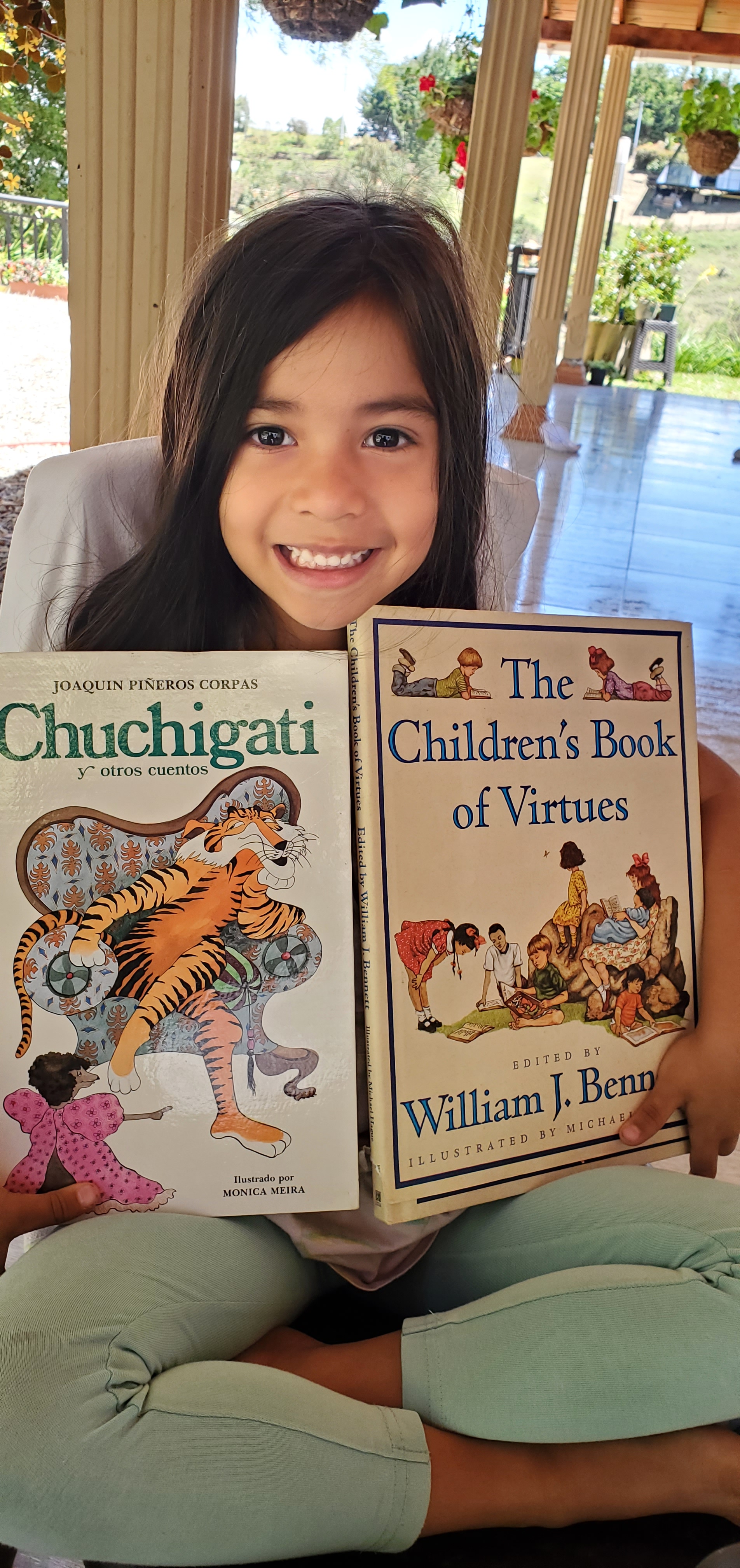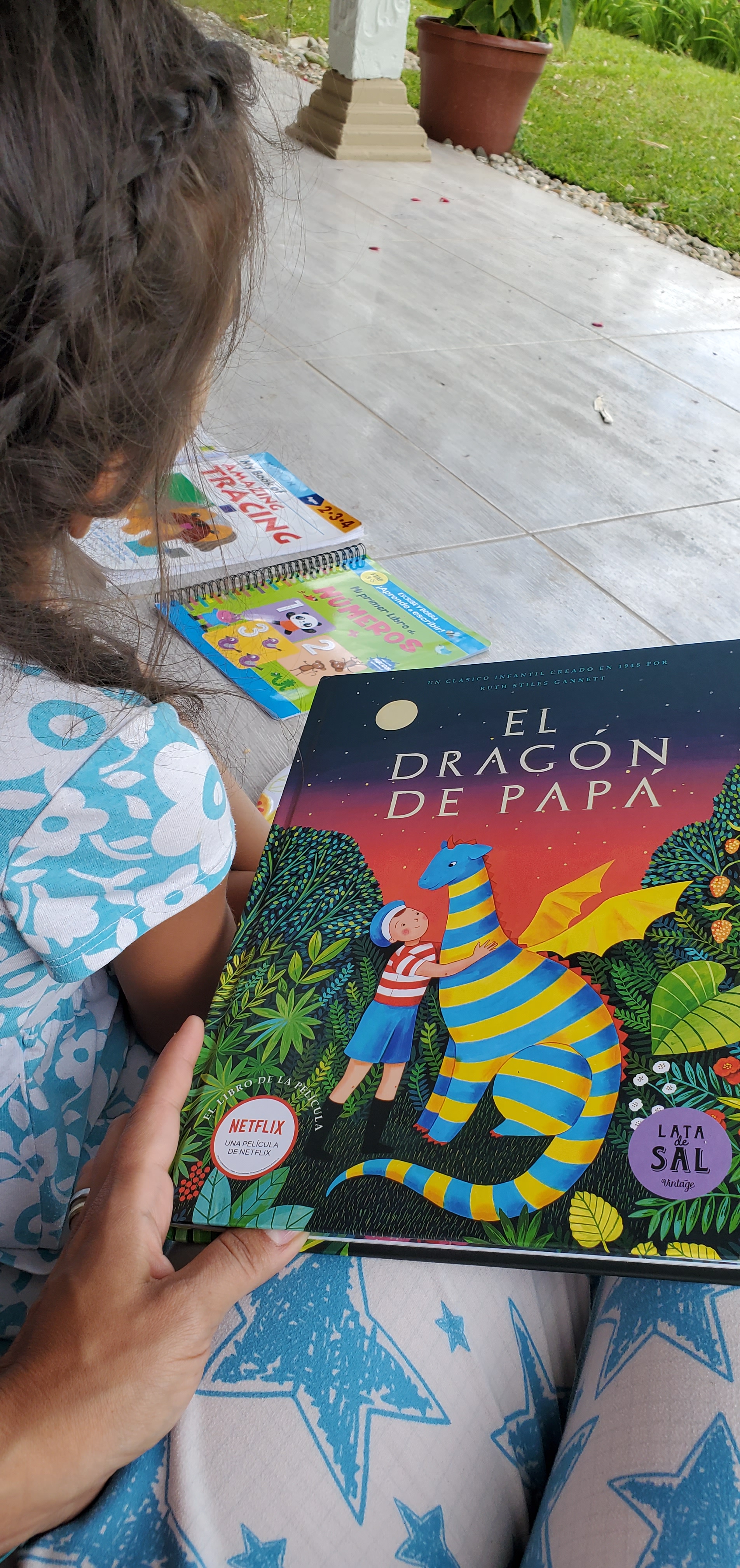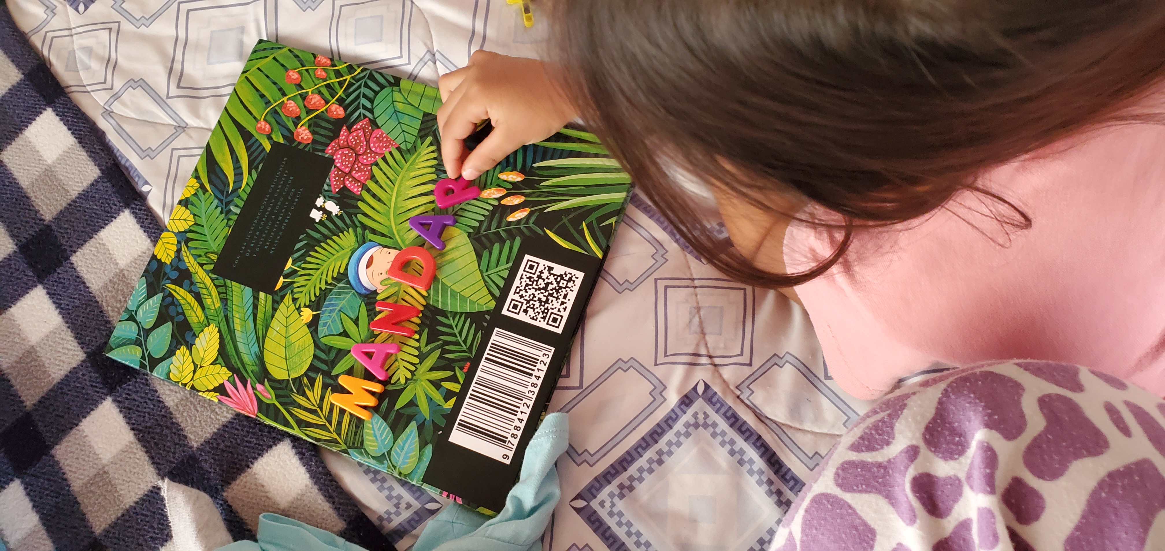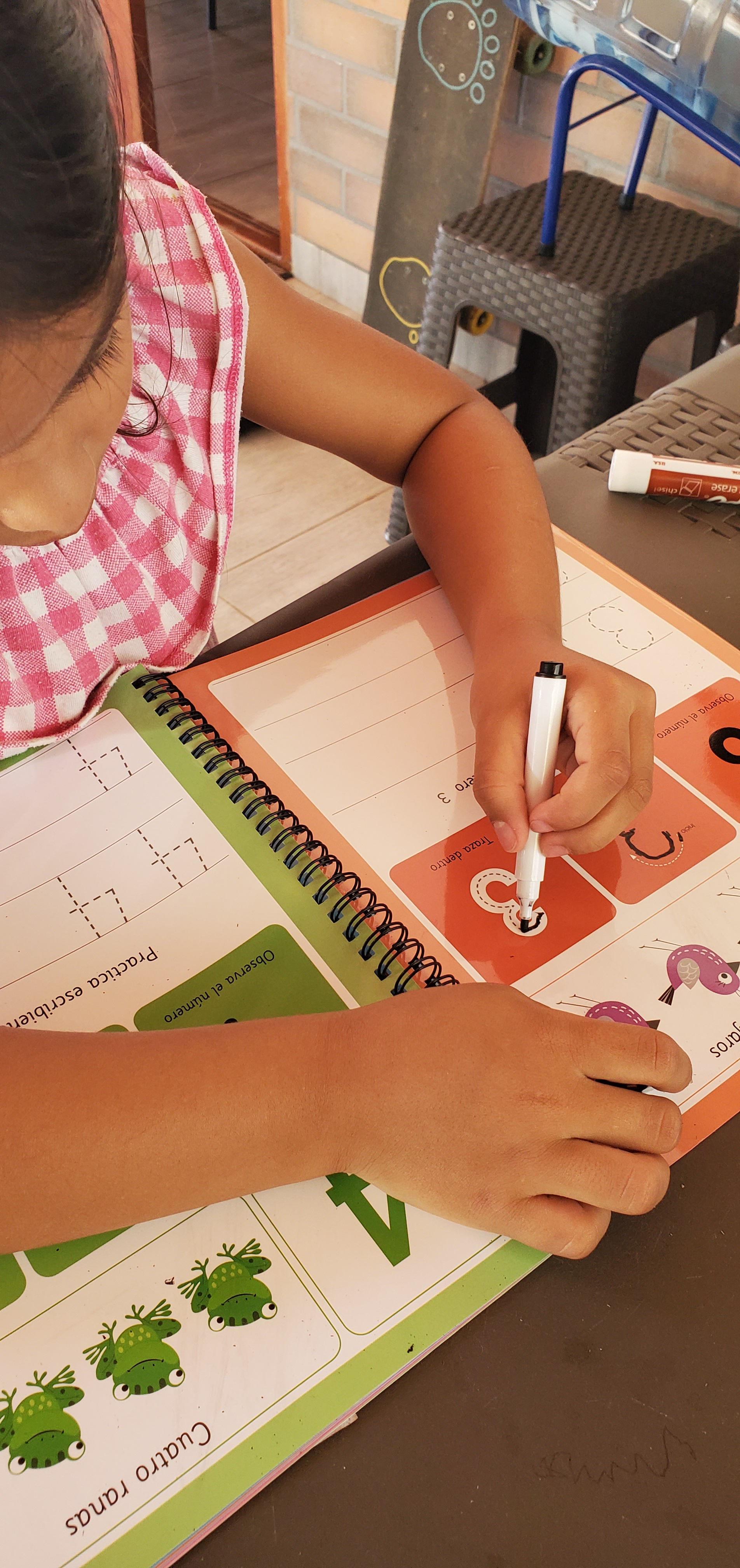Sarita por su parte, continúa absorbiendo ideas del ambiente: de las narraciones de su hermano, de los himnos, el arte que apreciamos, las lecturas en voz alta, la poesía, la vida diaria, los experimentos grupales y la naturaleza. Este año fuimos más intencionales con los horarios de las lecturas preparándonos para el próximo año que empezará formalmente. Hay un mayor interés en la lectura, puede escribir muchas palabras en español solo con el reconocimiento del sonido de las letras y, algunas veces y solo cuando tenía voluntad hicimos algunos ejercicios de formación de palabras, y trazos de letras y número. Anticipamos mucho su primer año, poco a poco ayudándola a entender los nuevos hábitos que tendremos y las nuevas rutinas que se vienen.