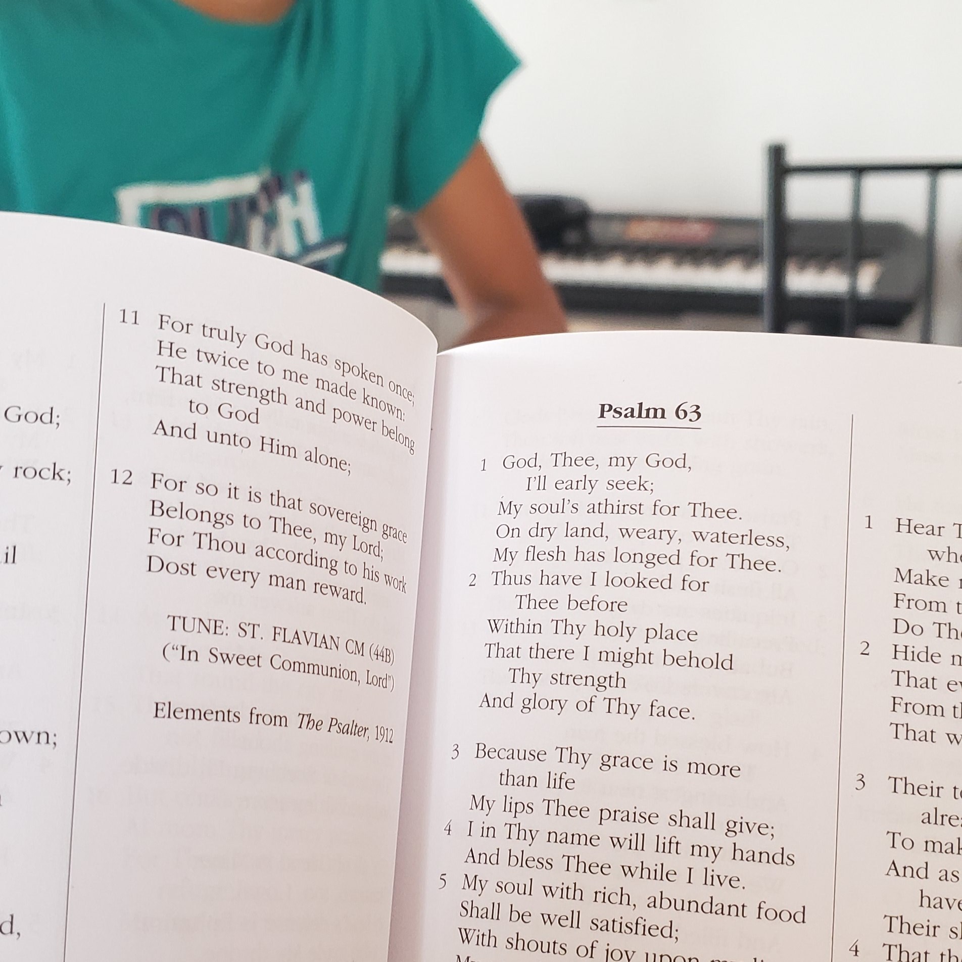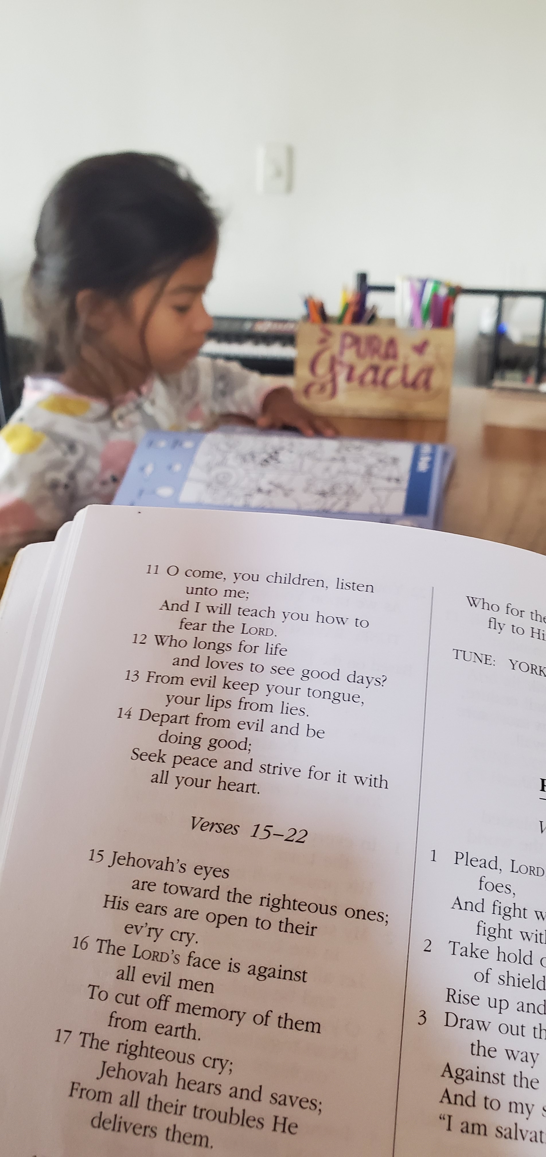 Recitación: Escogimos por trimestre un poema (en ambos idiomas), un himno en inglés, y esta vez un pasaje bíblico en portugués (idioma en aprendizaje). Daniel lee uno diferente todos los días de forma alternada durante un trimestre hasta que los memoriza. También iniciamos una recitación familiar de los Salmos. Todas las mañanas en nuestro tiempo devocional leo siempre en voz alta el mismo Salmo hasta que podemos decirlo de memoria, esta actividad es en inglés y usamos un salterio, después de memorizar el Salmo lo cantamos con la música sugerida en él.