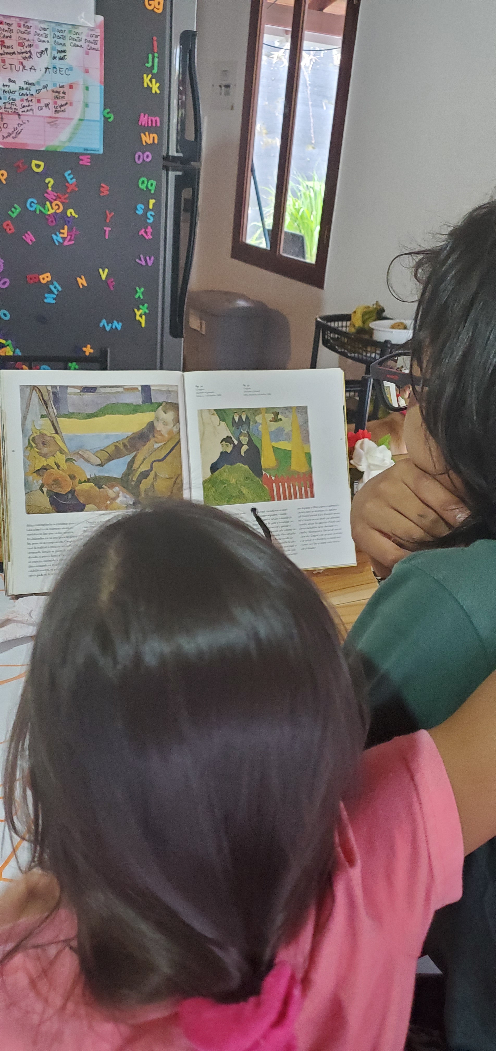 Apreciación del arte y música: Seguimos con un artista y un compositor cada trimestre e intercalados cada semana. Hemos aprendido a hacer bocetos completos o parciales de memoria después de observar la obra y a identificar la paleta de colores predominante. Este año estudiamos el impresionismo con Seurat, Van Gogh y Gauguin.