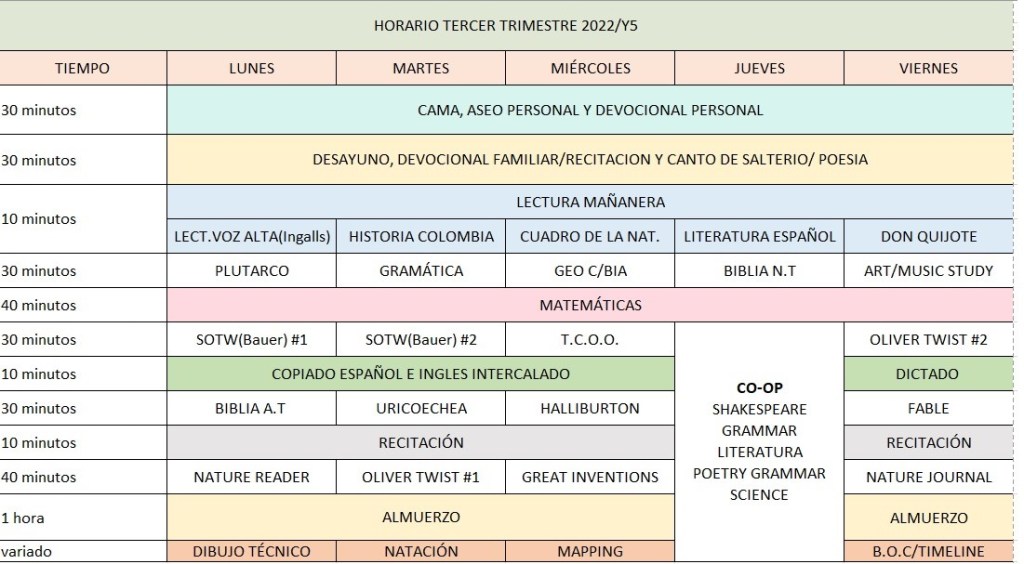 Nuestro Horario de rutinas quedó organizado así después de haber empezado nuestro grupo presencial. Los compañeros de Daniel están en año 7 de Ambleside Online, así que él se une a su programa de gramática, hacen también Shakespeare y poesía medieval. Todo esto completamente en inglés y en español con el grupo hacemos ciencias y literatura. Otro día de la semana dentro de nuestro horario hace conmigo gramática en español, dictado y el resto de actividades registradas en el cuadro.