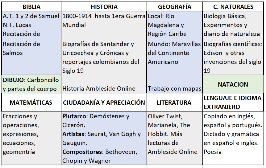 Nuestro año académico se encuentra resumido en este cuadro: la mayoría de los libros que usamos son correspondiente al año 5 del currículo Ambleside Online. También incluimos libros en español para cubrir nuestra historia local, literatura hispanoamericana y poesía.